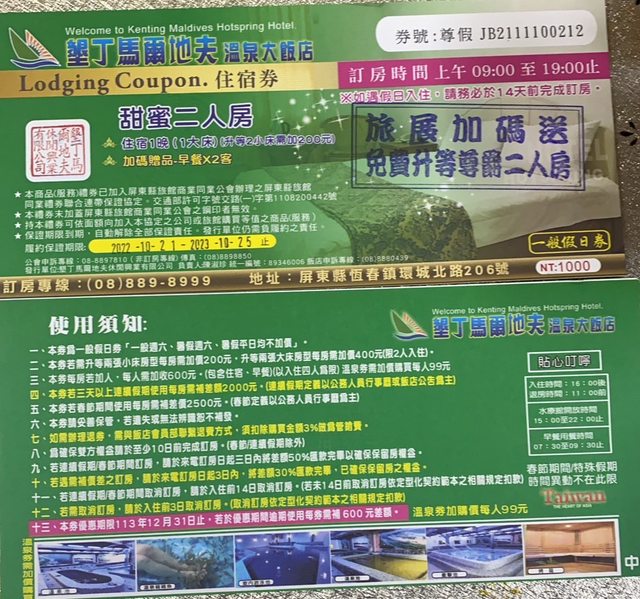 標題[交易] 墾丁馬爾地夫溫泉大飯店住宿券