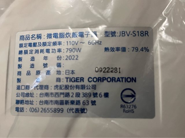 電子鍋 日本製10人份(全新)虎牌微電腦電子鍋 型號:JBV-S18R 製造日期如圖片 台中市面交 售:2500元