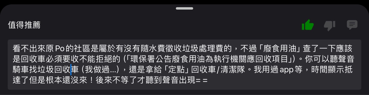 → baolidab: 另外有廚餘回收的話,你少量倒進去就好 111.82.119.112 11/17 08:40