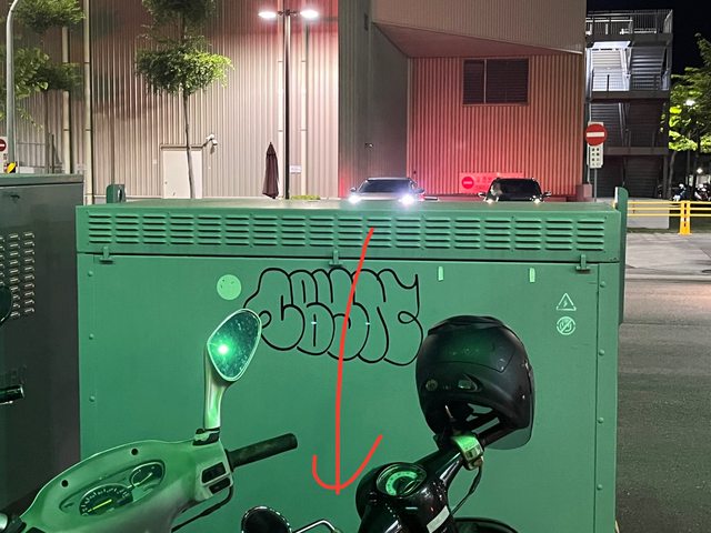 在站牌前、好市多地下汽車停車場出口前的電箱下方水泥墩上