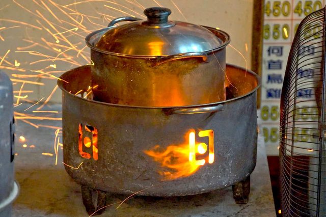 透過巧妙的炭火技巧,炭火隔著桶子將雞肉均勻加熱,使其達到完整而透徹地烤熟。