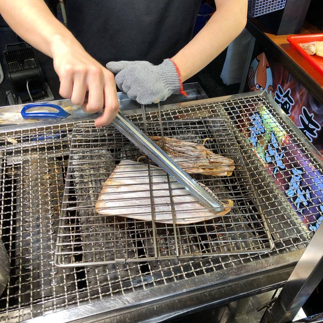 看到老闆熟練的將手工蜜汁魷魚片攤開在火爐上