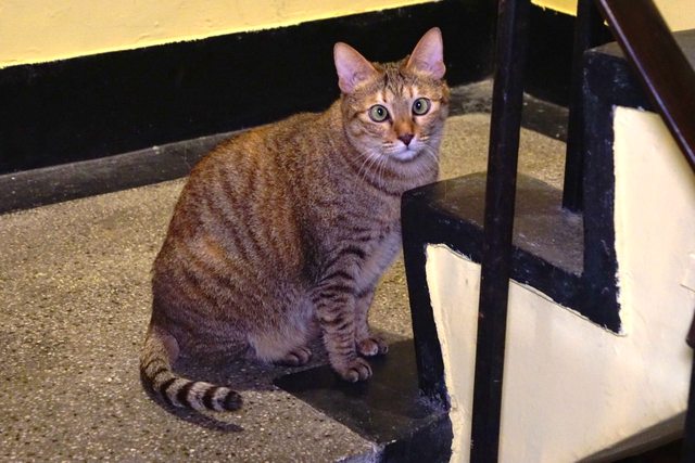 在通往船長先生餐酒館二樓的樓梯間,意外地遇見了一隻超可愛的店貓。這隻貓優雅地坐