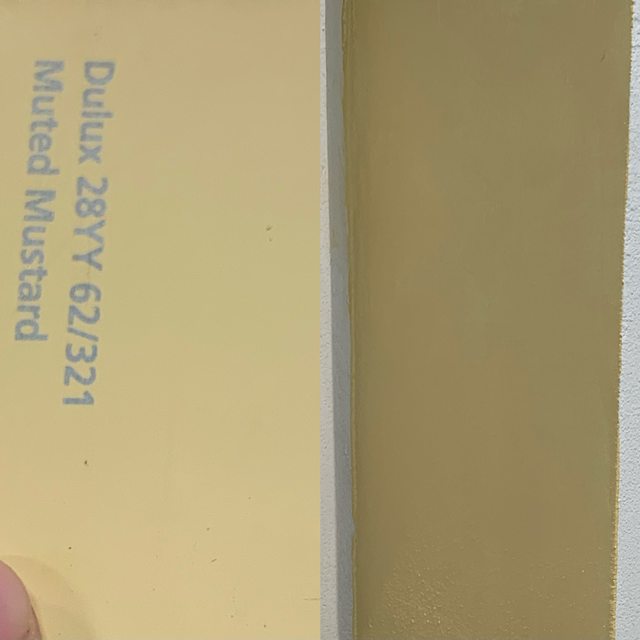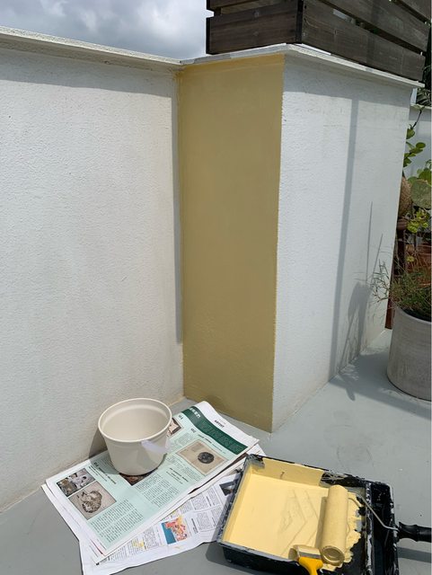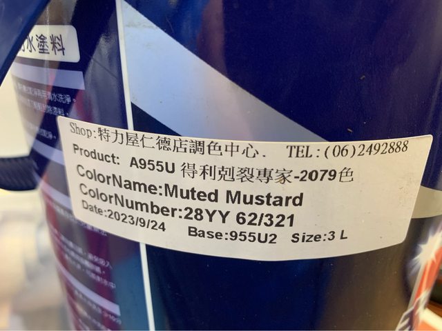 買了一桶得利戶外防水漆調了28YY土黃色,原價$799,但因試塗後與心中想要的顏色有一