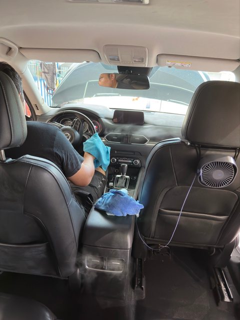 當內裝清潔完成後,汽車溫度也降到低許多。開始使用清潔藥劑噴灑全車