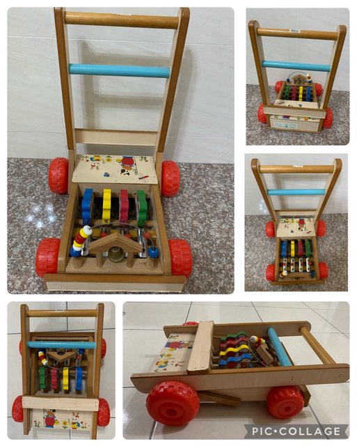 有使用痕跡,有鈴鐺跟敲打的鐵琴,可以折疊收納,存放室內。