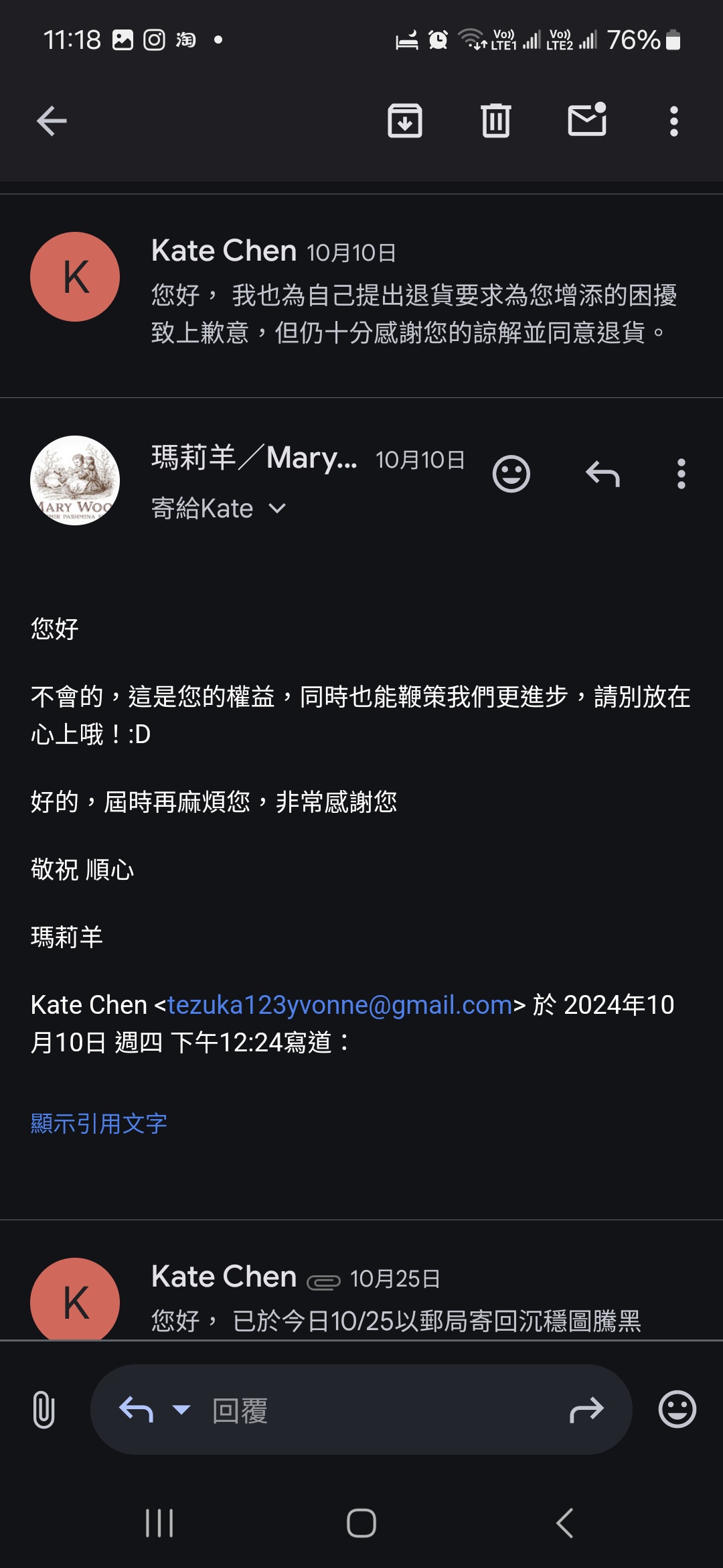 → kate64: 剛才賣家IG連繫我,我將雙方對話如實截圖附上 10/30 08:04