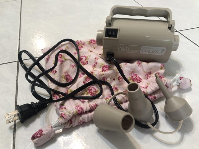 為充氣床墊而買,一樣少用,外盒已丟,平時用束口袋裝著!