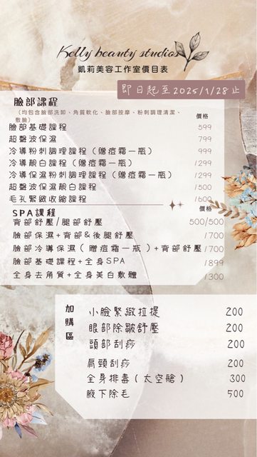 以上均包含卸妝洗臉、去角質、臉部按摩、粉刺深層清理、敷臉