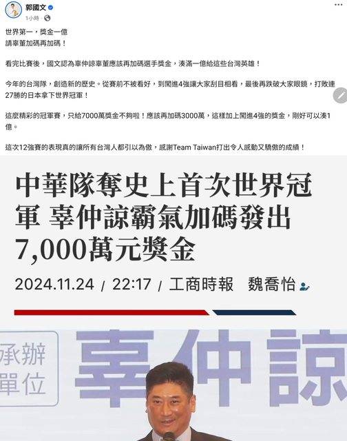 推 QkooQ: 郭國文要自己加碼到一億,真的太棒了 11/25 06:53