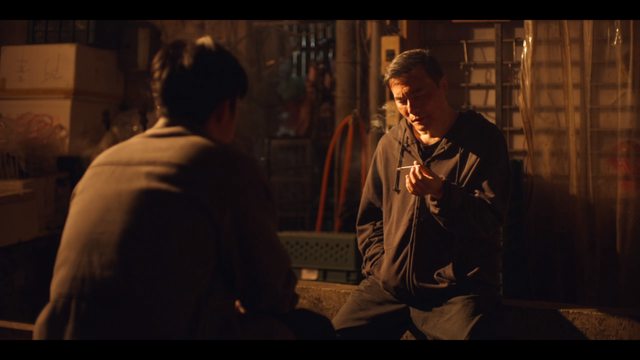 了結當年血案的真兇後,兩人對坐著抽菸聊天,四周只有暗黃的燈光與煙霧包圍著他們