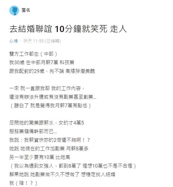 噓 Lalef : 台女只想找比自己高薪的? 11/25 03:26