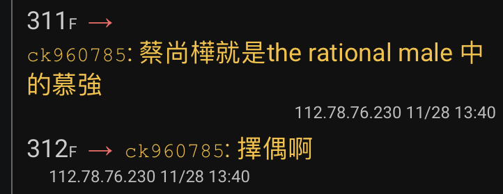 → aimlin : 男的高學歷工作好身高夠 台男pr90以上 11/30 13:30