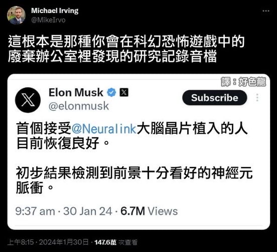 馬斯克1月29日在推特上表示,Neuralink首次將其大腦晶片植入人體,患者「恢復得很好