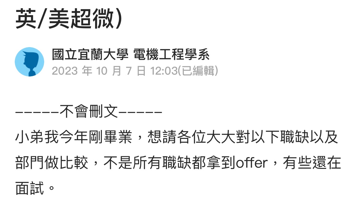 → qmei999 : 在那亂?連這家公司的offer都拿不到在那亂版實在很 11/19 10:55
