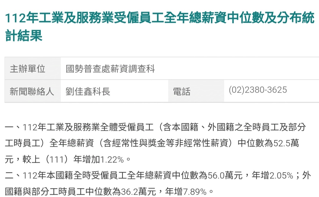 推 lopwer : 4.3萬是包含分紅的總薪資中位數,3.8萬是經常性薪資 02/17 22:30