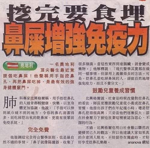 Ccsteeker : 屎更徹底的排出,我覺得洗澡挖鼻屎 180.217.4.67 07/23 11:52