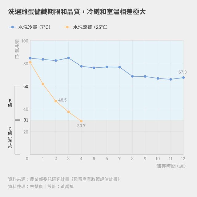 此外,由於推動洗選蛋時,台灣沒有低溫運送雞蛋的概念,學者專家折衷訂出25℃、可保存