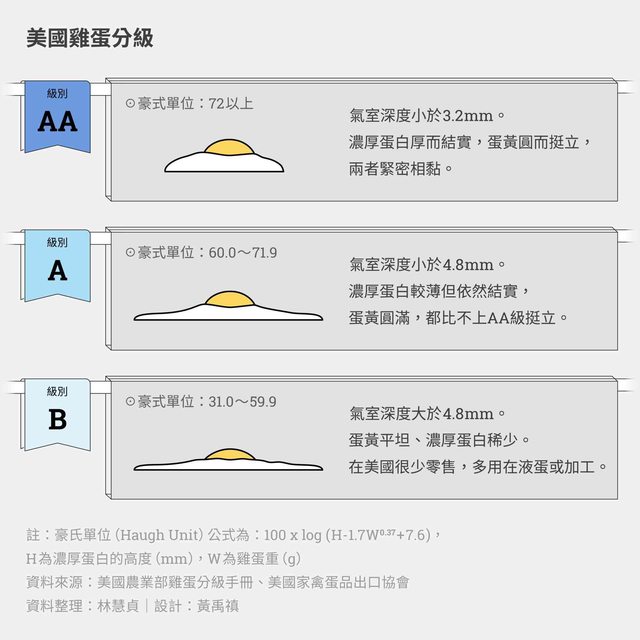 標準,數字愈高,蛋的品質就愈佳。美國農業部將雞蛋分為三級,豪氏單位在72以上為AA級
