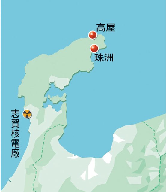 島西南側的志賀核電廠,地震時發生變壓器爆炸、燃料池水外洩等事件,珠洲市距志賀電