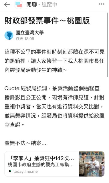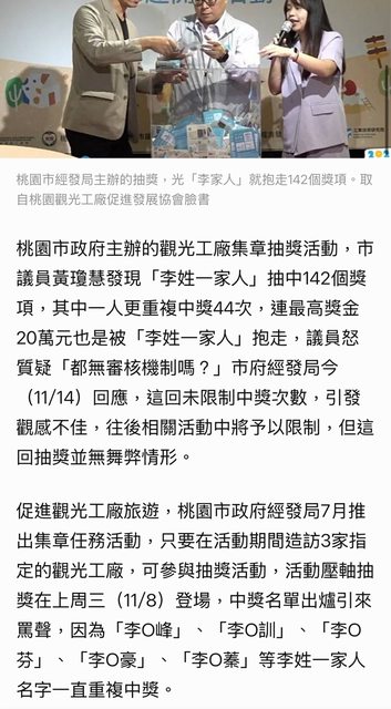 剛剛看Dcard 桃園也有類似的抽獎 一個家庭 抽中140幾個獎項 包含最大獎200,000 其中竟然有一個人單人直接中了44個獎 直接不演了 其實如果藉由這次財政部的事件 徹底把這些事情揭開 也算是全民之福吧? 閒聊討論看看 -- ※ 發信站: 批踢踢實業坊(www.ptt.org.tw), 來自: 60.251.209.52 (臺灣) ※ 文章網址: https://www.ptt.org.tw/WomenTalk/M.1730943793.A.8EE