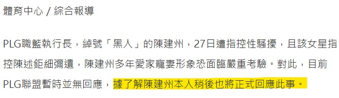 → joanzkow : PLG執行長陳建州遭指控性騷 「職籃國父」寵妻形象 06/27 11:53