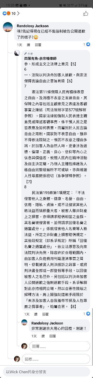 推 AhUtopian : 你要我提供法律意見,當然歡迎你聯絡我呀。 06/30 20:35