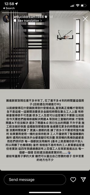 很多朋友留言說工人太誇張 但其實亂噴屎尿只是施工日常, 近期最誇張的就屬前幾天回國 開門回到家燈一打開 直接傻在原地球場的兩面落地窗拉到最開連紗窗都沒拉上心裡祈禱應該沒事吧, 沒什麼東西跑進家門吧 直到走上二樓客廳發現 竟然有一隻烏在裡面飛來飛去 當下太驚嚇沒拍到鳥翱翔的畫面 有時候會覺得這些工人腦子到底装什麼 家中有攝影機 在國外的時候發現有一晚門沒關上,隔天就提醒記得關上門窗 而且在出國前千交代萬交代 結束後一定要把所有門窗關上 講到巳經爛掉了 他們還可以繼續這樣擺爛 也是滿佩服的 讓我想起之前和設計師聊到工人的情況 他說了一句讓我印象很深刻的話 “這就是為什麼他們只能做工〞 Respect is earned not given! 活在世上每個人就好像品牌,怎麼經營自己就傻經營品牌 以上為主臥外被蟲屍體和烏屎蟲炸完的慘況 (還好我主臥鎖起來不然那天晚上就要睡在鳥屎中了) 備註 講的蠻有道理的欸 -- ※ 發信站: 批踢踢實業坊(www.ptt.org.tw), 來自: 36.231.167.124 (臺灣) ※ 文章網址: https://www.ptt.org.tw/Gossiping/M.1689916359.A.F8A