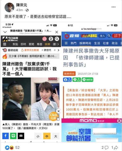 wish8042 : 極大機率大牙不起訴結案,然後判決書裡頭提到間接認 07/24 20:40