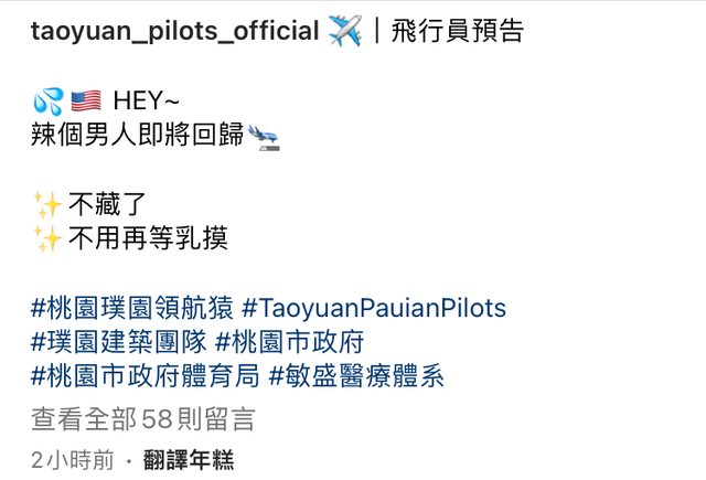 飛行員預告 HEY~ 辣個男人即將回歸 不藏了 不用再等乳摸 #桃園璞園領航猿 #TaoyuanPauianPilots #璞園建築團隊 #桃園市政府 #桃園市政府體育局 #敏盛醫療體系 _ 看來阿本確定回歸了! 剩下的洋將不知道會是誰 -- ※ 發信站: 批踢踢實業坊(www.ptt.org.tw), 來自: 223.139.202.217 (臺灣) ※ 文章網址: https://www.ptt.org.tw/basketballTW/M.1693723005.A.F33