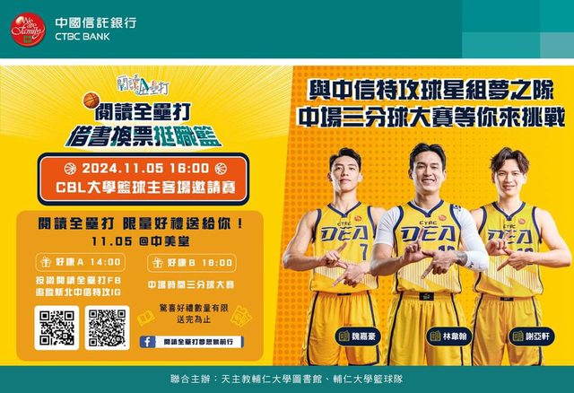 【11/5閱讀全壘打前進輔大中美堂!!大學籃球主客場邀請賽等你來玩】