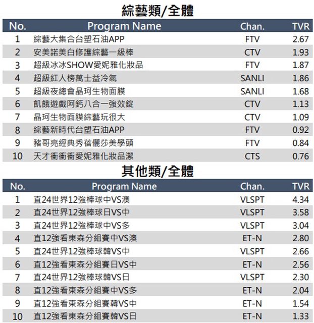 中華台北在分組賽最後一名 最終在參賽20隊裡面排名第17名 但收視卻更高