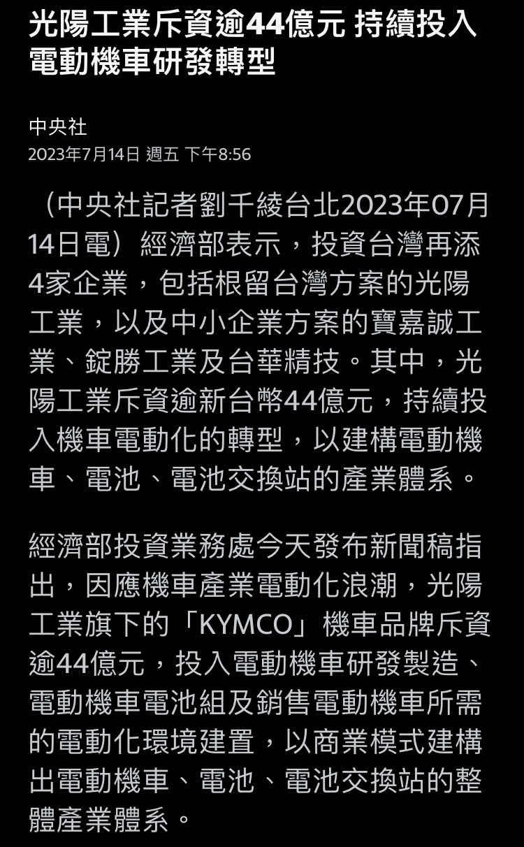 推 komachi275: 另一則新聞說光陽投入44億去轉型電動 39.9.168.182 07/20 10:35