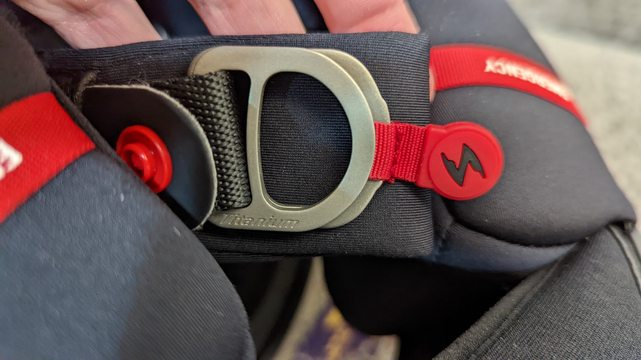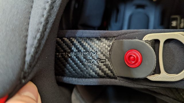 採用鈦金屬雙D扣,紅色織帶也有Scorpion Logo