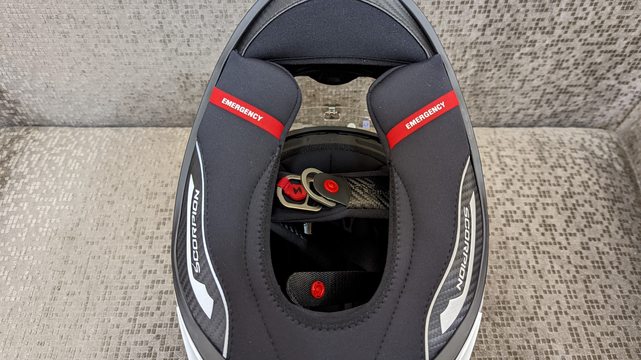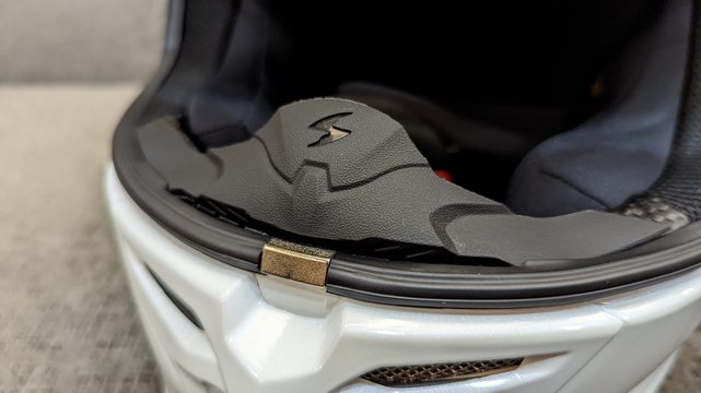 頤帶外層仿碳纖花紋,也壓有Scorpion Exo