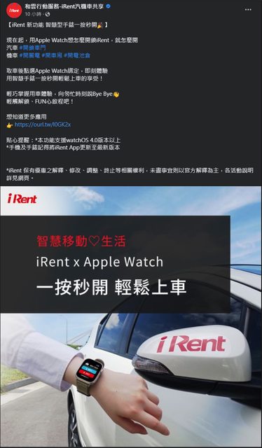 標題[閒聊] iRent新版支援Apple Watch開關電/車廂等