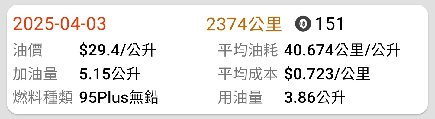 推 jimmyi04046: 同樓上 1月牽車 2.7km 加92 市區油 223.137.42.184 05/05 16:48
