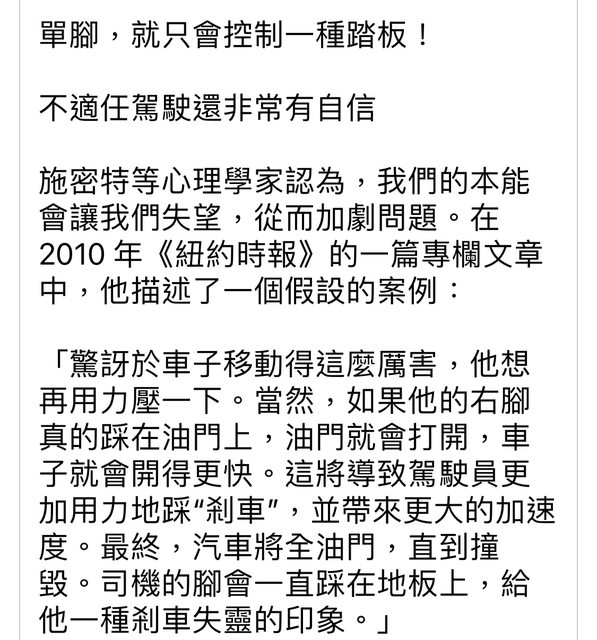 → ming791218 : 講左腳煞車比雙腳開車準確,台灣左腳煞車是拿不到駕 06/24 20:07