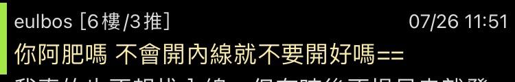噓 johnny30489 : 不會開內線就不要開好嗎?四輪素質? 08/07 18:40