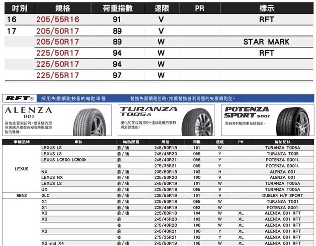 目前RFT輪胎已經將各尺寸的輪胎分散到ALENZA, TURANZA,POTENZA三種系列。