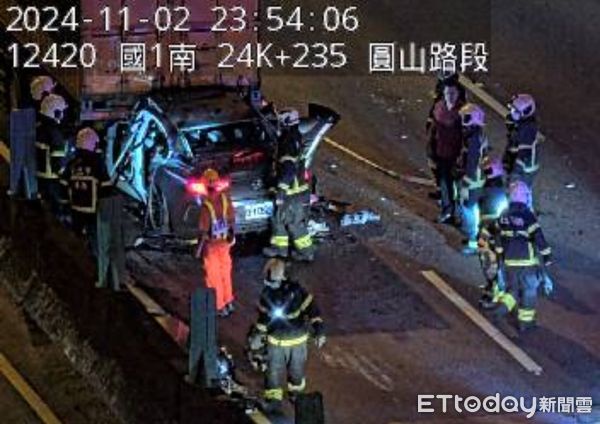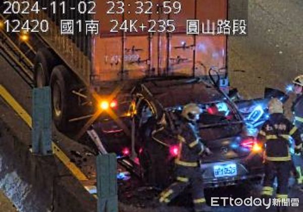 → cosmite: ▲國1圓山段賓士轎車插進大貨車尾,車頭夾扁駕駛傷重不 11/03 10:34