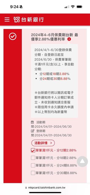 → ah7675 : 其實蠻清楚的,1000分三期0利率、12期2.88% 05/02 21:46