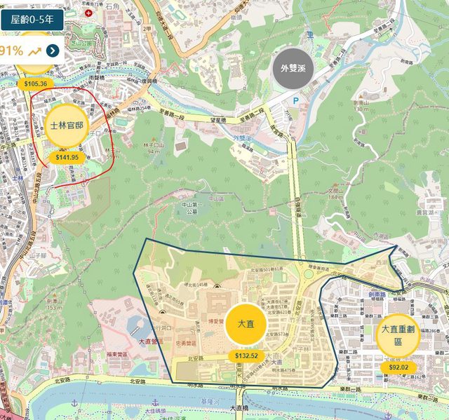 : 士林官邸(如圖) 屋齡0~5年房價已超越大直,來到約142萬/坪