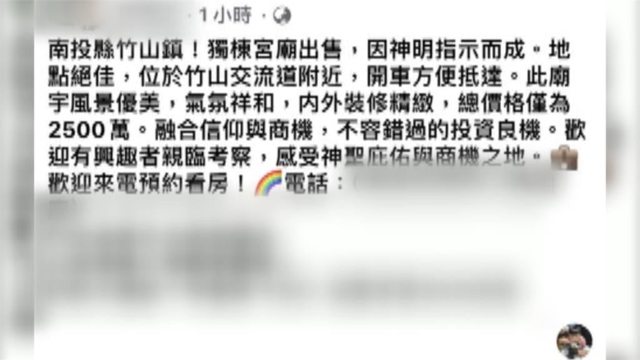,房仲PO文說,奉神明指示出售,售價2500萬,不過寺廟住持澄清,地主是廟宇創辦人,
