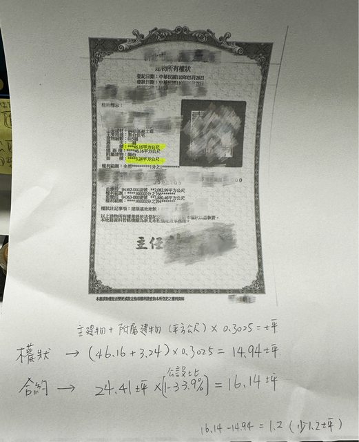 → Goog1e: 你權狀上不就有寫公設了 為啥不直接算 還要用公設比倒推? 07/19 16:57