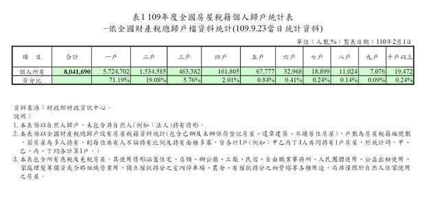 : 全國性房屋稅籍所有權人總歸戶,2020年擁有房子的人有 804.17萬人。