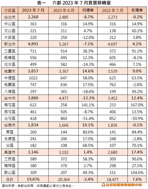 六都公布今年7月買賣移轉棟數,分別是台北2268棟,月減8.7%,年減0.2%;新北4891棟,