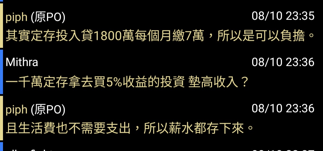 → piph: 其實定存投入貸1800萬每個月繳7萬,所以是可以負擔。08/10 23:35