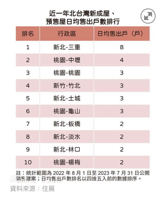 統計顯示,北台灣每日平均售出戶數排行中,新北五區入榜,桃園有四區,新竹則有一區