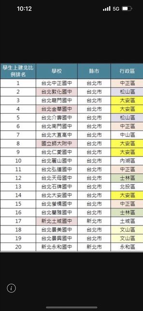 這張表是 之前公布北北基 考上建中北一女的學校排名表(後來引起軒然大波 ,之後就不 公佈了,因為瞎子都看得出來 台北市的教育資源確實猛,不能說的秘密被大家發現了) 1-16 名都是台北市國中 第17名才是 新北的土城國中(正確來說應該是土城國中資優班) 新北傳統強校 海山 中山 才排到20幾名之後 今年土城國中榜單 https://i.imgur.com/AWmXmnf.jpg